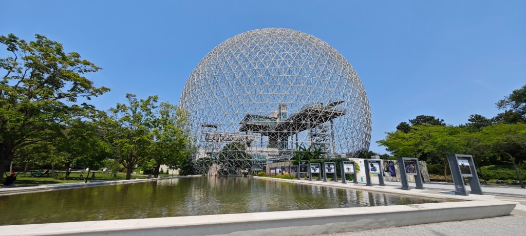 O kus dál stojí globus zvaný Biosphére, celý postavený z ocelových trubek, který byl včera barevně nasvícen. Dnes slouží jako muzeum životního prostředí.