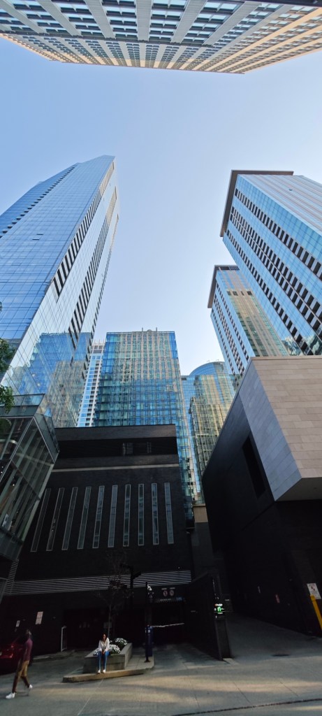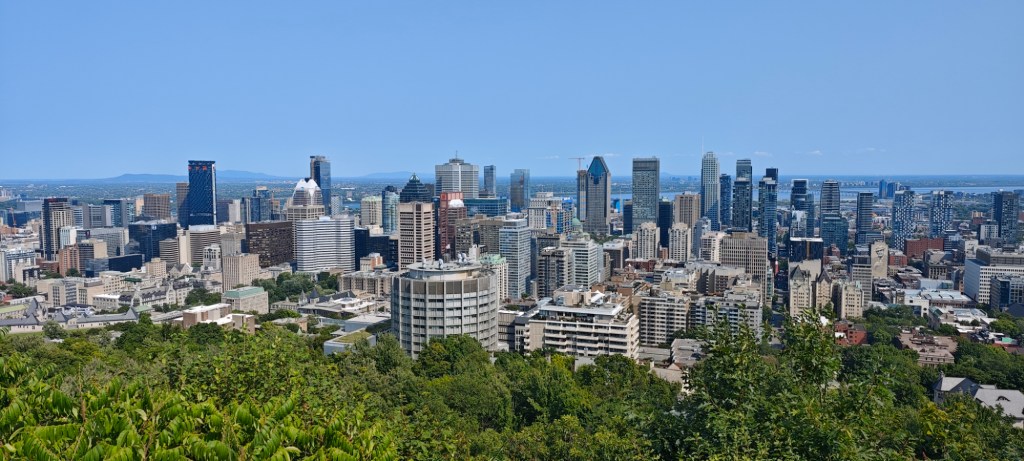 My se vydáváme metrem do centra a dál pěšky na kopec Mont Royal. Z vyhlídky Belvedére máme mrakodrapy jako na dlani. Nedá nám to a jdeme se mezi ně projít. Vlastně mezi takovými velikány stojím prvně v životě. Hlavu si mohu vykroutit, když chci spočítat těch 50 pater. Mezi nimi je v létě příjemně, je tu pořád stín. Jen do těch spodních bytů se slunko za celý den nepodívá.
