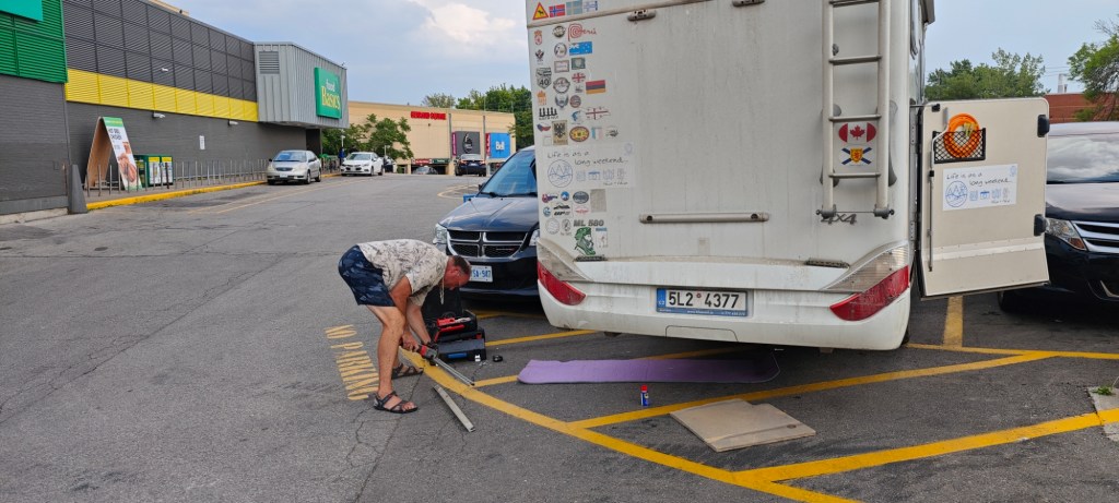 Dvě ze čtyřech hliníkových lišt, které nádrž ze spodu zajišťují, se přetrhly a nádrž jsme kus táhli po asfaltu. Průšvih jako vrata, blokujeme dopravu, vypouštíme vodu, kterou jsme před hodinou nanosili zase v konvích, a snažím se nádrž provizorně přidrátovat, abychom mohli vůbec odjet. Místo rozloučení sháníme dvě hodiny pevnější profily, které na parkovišti před supermarketem vyměňujeme. Martin mi asistuje, Eliška mi nakoupila potraviny na týden, než přejedu kontinent na do Calgary, kam to mám 3500 km. Ještě že mám celý vercajk s sebou, jinak bych si s tím neporadil. V 8 večer mám hotovo. Nádrž je fest upevněna, jen nevím, jestli nepoteče.