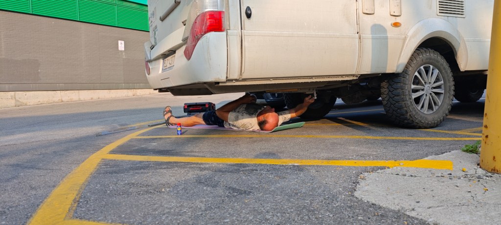Jsem černý jak bota, jdu se umýt do restaurace „U dvou zlatých oblouků“ na WC. Voda tam tekla čůrkem, připadal jsem si jako bezdomovec. Umyl jsem si ruce, obličej a kolena, a celý zpocený jedeme shánět vodu. Našli jsme ji na pláži, dokonce nám i délka hadice stačila. Jenže nádrž teče proudem. Za svitu čelovky jsem zjistil, že se roztrhla napouštěcí hadice. To zjistím až ráno, jestli to není něco horšího. Rychle jsem se vysprchoval a děcka hodil na ubytovnu, kterou si předem sehnali. Po čtyřech týdnech spí zase v bílých peřinách. Já se vracím na pláž, a přemýšlím, co budu zítra dělat s nádrží. Ráno koukám na budíky a ukazují 100% vody. Jásám jako malé děcko, a ještě se koukám pod auto. Je tam suchóóó.!