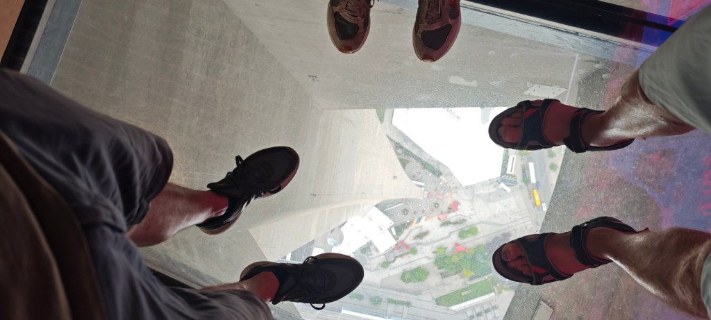Nemůžu ale odjet z Toronta, abych se nepodíval na Kanadskou národní věž, neboli CN Tower. Byla otevřena v r. 1976 a tři desetiletí to byla se svými 554 metry nevyšší stavbou světa, než jí v r. 2007 trumfli stavbami na Arabském poloostrově. Koupili jsme si lístky až nahoru, a z výšky 445 metrů přehlížíme celé město. Mrakodrapy se pod námi krčí jako malé děti. Jen jim natáhnout ruku. Pohled to byl opravdu fascinující. V poledne se s mladými definitivně rozloučíme a já mířím na „divoký“ západ.