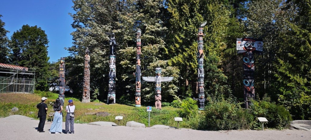 Park je naším hlavním cílem procházky, podél moře jsou krásné výhledy na město, přístav, startující hydroplány. Navštívili jsme mořské akvárium se spoustou obdivuhodných živočichů, prehistorických koster ryb, korálů, a venkovní bazény se skotačícími lachtany. Kousek vedle objevujeme Totem Pole. Totemy sem byly svezeny ze zaniklých indiánských rezervací. Cestu si zkracujeme přes vzrostlý les s mohutnými stromy. Park není žádný drobeček, kolem dokola je to víc než 10 km. Potkali jsme tu policistku na koni a dozvěděli jsme se, že její maminka pochází ze Slovenska, ale ona česky nebo slovensky neumí nic. Rozloučila se však s námi odpoledne pozdravem „dobré ráno“. Chtěli jsme ještě vidět botanickou zahradu Britské Kolumbie, ale uvízli jsme v zácpě aut odpolední špičky a skoro tři hodiny se probíjíme ven z města.