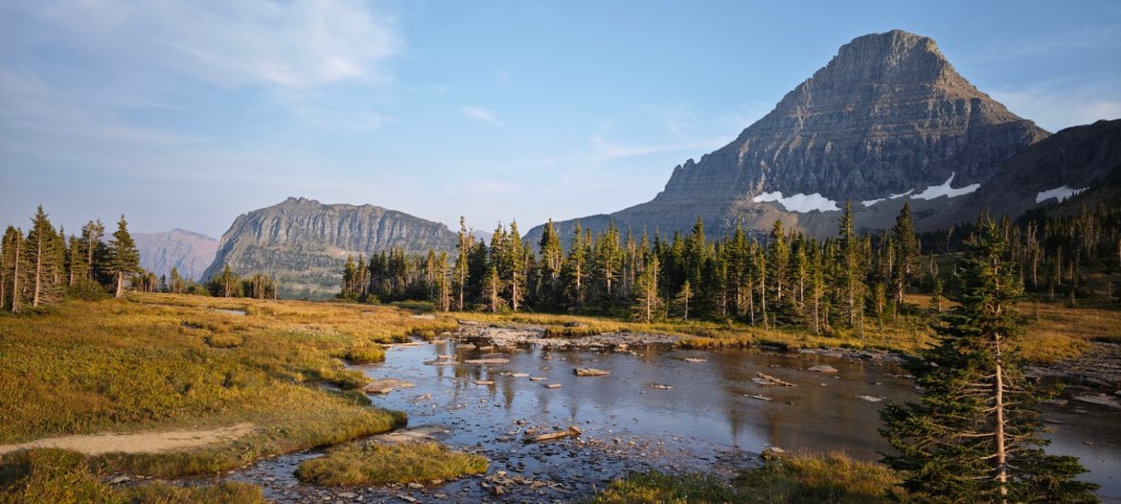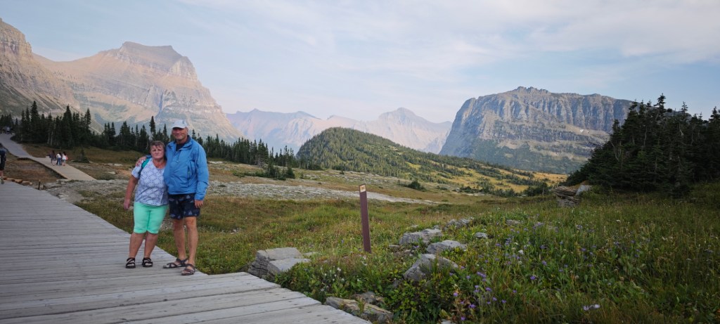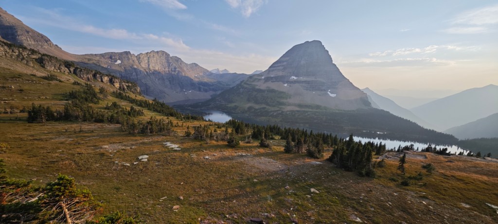 Na sedlo vyrážíme až v půl páté, nechali jsme tu první vlnu aut odjet, bylo to dobré rozhodnutí. Měli jsme klid na skutečně velkolepé výhledy. Z Logan Passu 2066 m.n.m. kráčíme po dřevěných lávkách přes vřesoviště k jezeru Hidden Lake. V podvečerním světle byly štíty kolem nás osvícené zapadajícím sluníčkem, no prostě nádhera.
