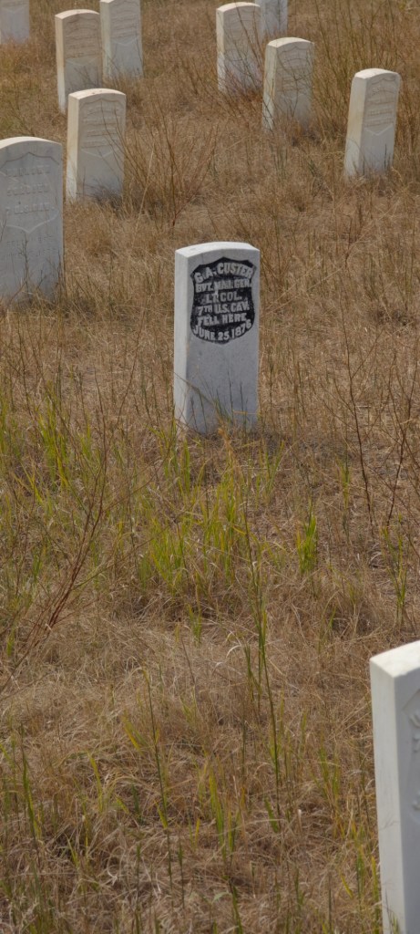 Velmi mě zaujal jeho životní příběh: Vystudoval vojenskou akademii ve West Pointu a při závěrečných zkouškách byl sice poslední, ale přesto se stal nejmladším brigádním generálem. Za občanské války Severu proti Jihu dosáhl významných vojenských úspěchů a zasloužil se ke konečnému vítězství Unie. Za své kariéry byl dvakrát suspendován, poprvé nechal popravit vojáky, kteří dezertovali během nuceného pochodu Kansasem a podruhé za zmasakrování indiánských žen a dětí kmene Šajenů. Pokaždé mu však byla hodnost vrácena. Největší slávu si neblaze vysloužil 25.června 1876 právě zde. Jeho sedmá kavalérie dorazila k řece Little Bighorn River jako první, kde narazila na indiánskou osadu. Custer nechtěl čekat na posily, které byly vzdáleny pouhých 9 mil a pustil se do pronásledování prchajících žen a dětí. Shodou okolností se v údolí konalo shromáždění několika indiánských kmenů. Custer s 268 vojáky vpadl do obklíčení dvou tisíc Lakotů a Šajenů. Bitva trvala pouhou jednu hodinu. Náhrobní kameny vojáků jsou přesně v místech, kde byli pobiti. Našli jsme i pomník generála Custera, jen kousek pod velitelským vrcholem. Na základě rozkazu prezidenta Granta bylo uspořádáno vojenské tažení, jež ve výsledku přineslo konečnou porážku indiánů Velkých plání. V roce 1926, při padesátiletém výročí bitvy, byly Velké pláně navráceny indiánům a potomci válčících stran společně a na vždy zakopali válečnou sekyru.