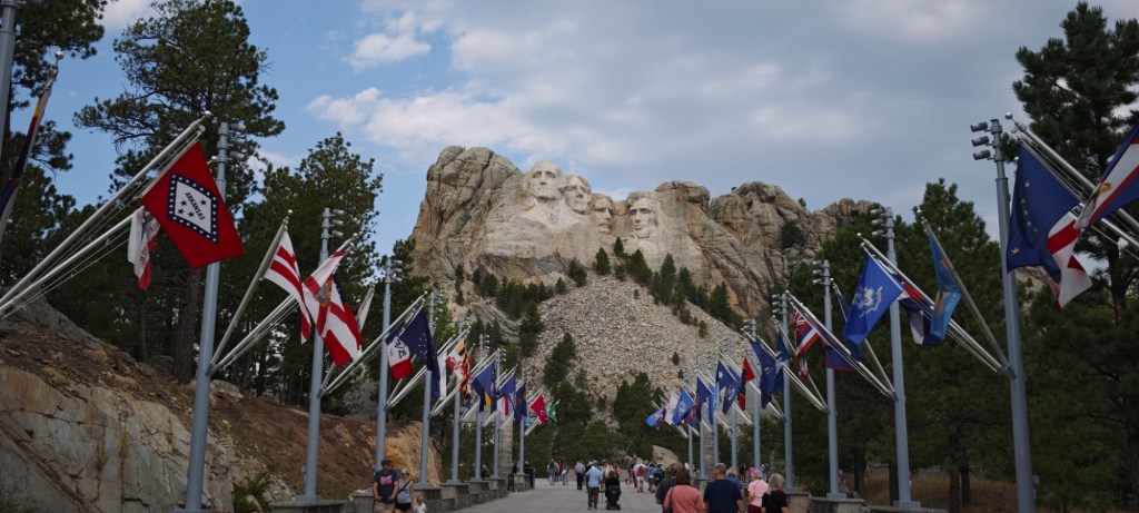Jeden z nejznámějších amerických národních památníků – 4 hlavy amerických prezidentů: George Washingtona, Thomase Jeffersona, Abrahama Lincolna a Theodora Roosewelta, vytesaných ve skále, jsou 18 m vysoké. Je to pomník národní hrdosti Američanů, a také to tak cítíme. Od vstupní brány procházíme pod památník uličkou se všemi dvaapadesáti vlajkami států unie. Autorem je sochař Gutzom Borglum, který začal vést práce v r. 1927, ve svých 60-ti letech. Zemřel v r. 1941, těsně před dokončením čtvrté, Rooseveltovy hlavy.
