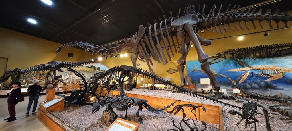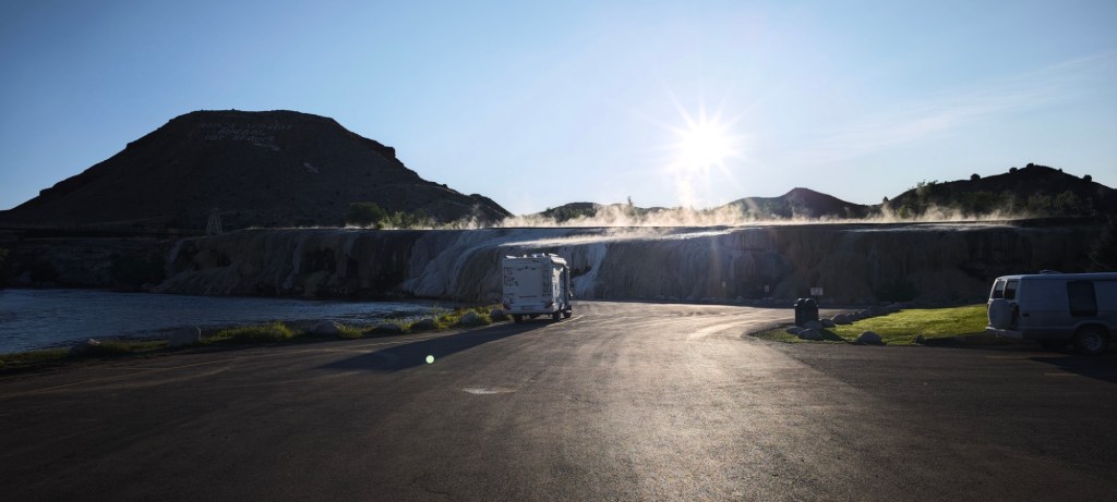 A skutečně. Za chladného rána se z nich zvedá k nebi pára. Parkujeme přímo pod terasami a ráno je po lávkách procházíme a obdivujeme se té nádheře. V nedalekých termálních bazénech si zaplaveme a po obědě navštěvujeme Wyoming dinosaur center. Muzeum s kompletními kostrami dinosaurů, největšími na Světě. Mají jich tu dvanáct, jsou 500–650 mil. roků staré. Popravdě řečeno, nechtěl bych je tenkrát potkat někde v lese.
