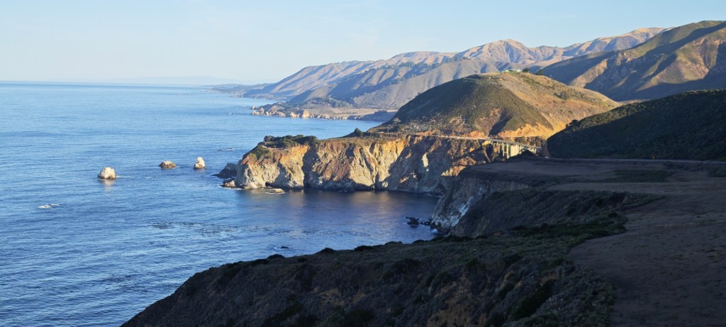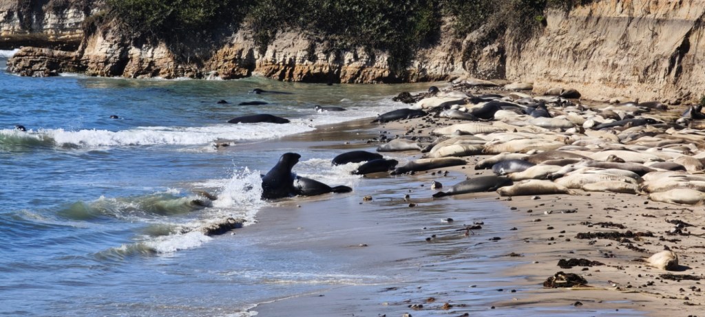 Moc se těšíme na vyhlášenou silnici HWY 1. Je to jedna že čtyřech nejkrásnějších vyhlídkových silnic Spojených států. Vine se vysoko nad pobřežím Tichého oceánu na jih od San Francisca. Na začátku musím natankovat nejdražší naftu v celé Americe. 6,40 dolarů za galon, dvakrát více, než kdekoli jinde v USA. Více než 40 Kč za litr v Čechách. Na pumpě si ověřuji, že prostřední část pobřeží je uzavřena pro sesuv svahu. Přesto si jedeme vychutnat nádherné výhledy. Nocujeme vysoko nad útesy. Nikdo tu už nejezdí a ráno si užíváme krásu pobřeží. Těsně před uzavírkou objevujeme státní rezervaci Aňo Nuevo. Sedmikilometrová pěší trasa míjí ostrov s opuštěnými dvěma domy hlídače majáku, který se zřítil v minulém století. Dnes ostrov obývá na deset tisíc rypoušů sloních a lachtanů. Pobřežní útes si oblíbili pelikáni kteří nám přelétávají nad hlavami.
