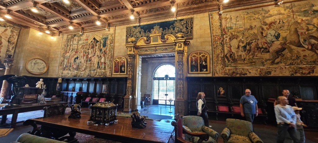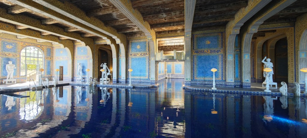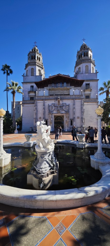 Jižní úsek silnice HWY1 nemůžeme vynechat, protože tu na kopci stojí jedna z mála stavebních památek severoamerického kontinentu. Haerstův hrad. Letní sídlo tiskového magnáta, který vlastnil 60% vydavatelství novin, časopisů a rozhlasových stanic v Kalifornii. Po svém otci zdědil rozsáhlé pozemky 100 000 ha, a na vrcholku kopce postavil v r. 1919 jednu z nejextravagantnějších staveb, které se říká „Neuschwanstein Ameriky“. Interiér zdobí artefakty z evropských hradů a kostelů všech uměleckých stylů. Dřevěné vyřezávané stropy, na stěnách gobelíny, biskupské lavice, gotické krby, maurské dlažby. Hlavní průčelí je kopií mudejárské katedrály, bazén zdobí řecké kolonády a sochy z italského mramoru. „Hrad“ nebyl nikdy zcela dokončen, hotové místnosti nechával znovu přestavovat, aby se do nich vešly nakoupené poklady. Hearst zemřel v r. 1957 a nemovitosti odkázal státu Kalifornie. Nám se líbily zahrady s bazény, ale jinak to působí jako vrcholná ukázka nevkusu.