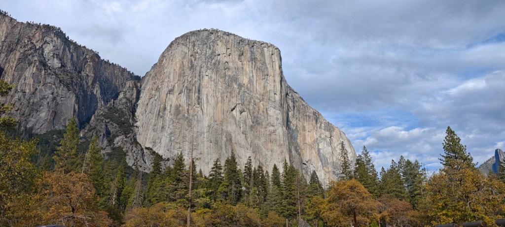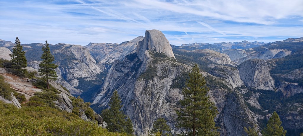 Pohled na masiv Half Dome z horní hrany kaňonu je dechberoucí. Vede na něj nádherná tůra, 26 km s převýšením 1400m. Je ale o ní takový zájem, že povolení k výstupu se každý den losuje. Vůbec v celém Yosemitském údolí je i na konci října plno turistů a horolezců, parkoviště přetékají auty. Z masivu vedle Ztraceného Šípu zmizel 458 m vysoký a mohutný vodopád. Letos v létě tu málo pršelo, došla voda. K vodopádu vede také krásný pěší výstup, ale není důvod jej absolvovat. Nahradil jsem si to výletem na vyhlídku do údolí Wawona, lesem gigantických sekvojí.