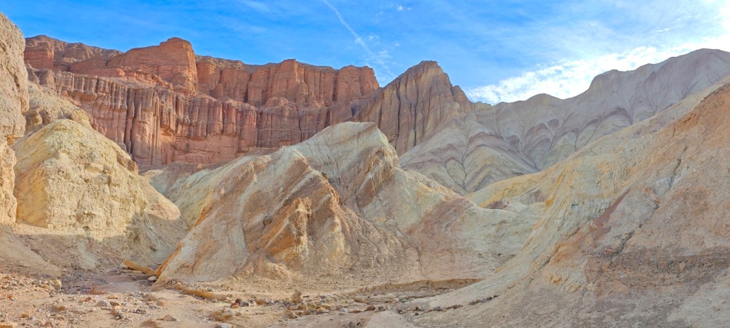 Po rozednění nás probouzí první přijíždějící auta. Za námi vede stezka Zlatým kaňonem k Červené katedrále. Stezka je necelých 2,5 km dlouhá jedním směrem s minimálním stoupáním. Páje trochu zabraly léky na kašel, nechce sedět zavřená v karavanu, tak jdeme spolu. U vstupu je výstražná cedule, nedoporučující vycházet na tůru po desáté hodině, trasa se pak mění v rozžhavené peklo. Cesta nahoru v půl deváté vede ve stínu okolních kopců, jde se dobře a my žasneme nad krásou barev zlatých odstínů a rudé hradby pískovců, uzavírající údolí.