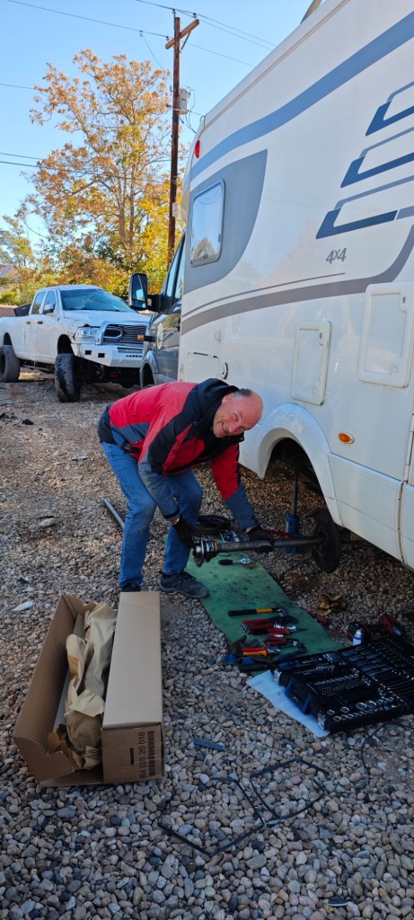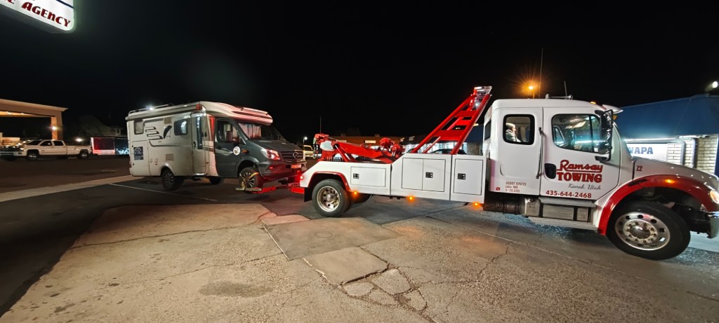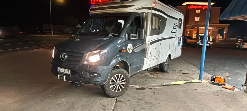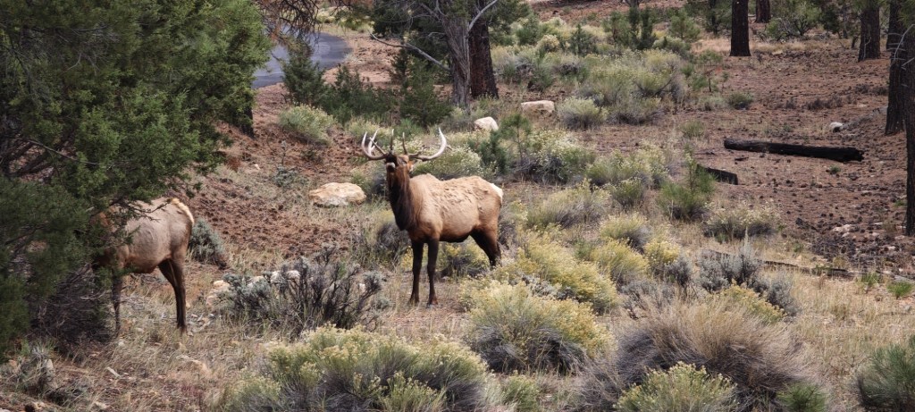 Odbočili jsme v podvečer na slepou, 74km dlouhou silnici, táhnoucí se hlubokým lesem ke Grand Canyonu ze severu. Náhle se ozval nám známý zvuk železného rachotu a bylo jasné, že jsme dojeli. couváme z kopce daleko na odstavné místo, jsme bez signálu, noc na krku, 2700 m vysoko, porašek sněhu, -7st.C. Zastavil nám místní hajný s parožím na autě, domluvili jsme se, že nám sežene pomoc. Za dvě hodiny dorazil šerif, zjistil co a jak a vysílačkou zavolal odtah. V 11 v noci přijel truck a vezl nás 100 km do nejbližšího města. Dovezl nás k servisu, prý zaplatit můžeme až ráno a zmizel.